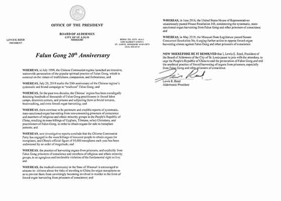 2019年7月,为支持法轮功学员二十年的反迫害努力,美国圣路易市议会议长路易斯·里德签发支持信,要求中共立即停止对法轮功的迫害。