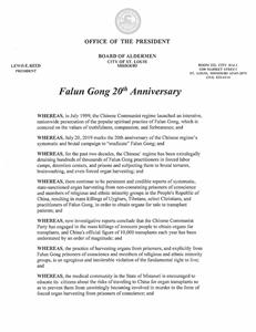 鉴此,我,路易斯·里德,圣路易市市议会议长,要求中华人民共和国立即停止对法轮功的迫害,以及对法轮功和其他良心犯的不道德的活摘器官罪行。