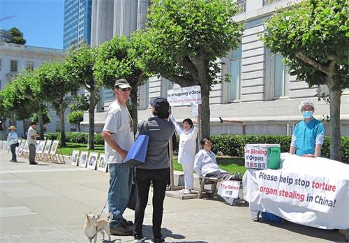原来今年的七月二十日是法轮功学员反迫害二十周年,旧金山湾区部份法轮功学员正在举办真相图片展和反酷刑展,传播法轮功的真相,揭露中共对法轮功学员持续了二十年的血腥迫害,同时呼吁各界共同制止迫害。许多民众驻足观看。了解真相后的民众。