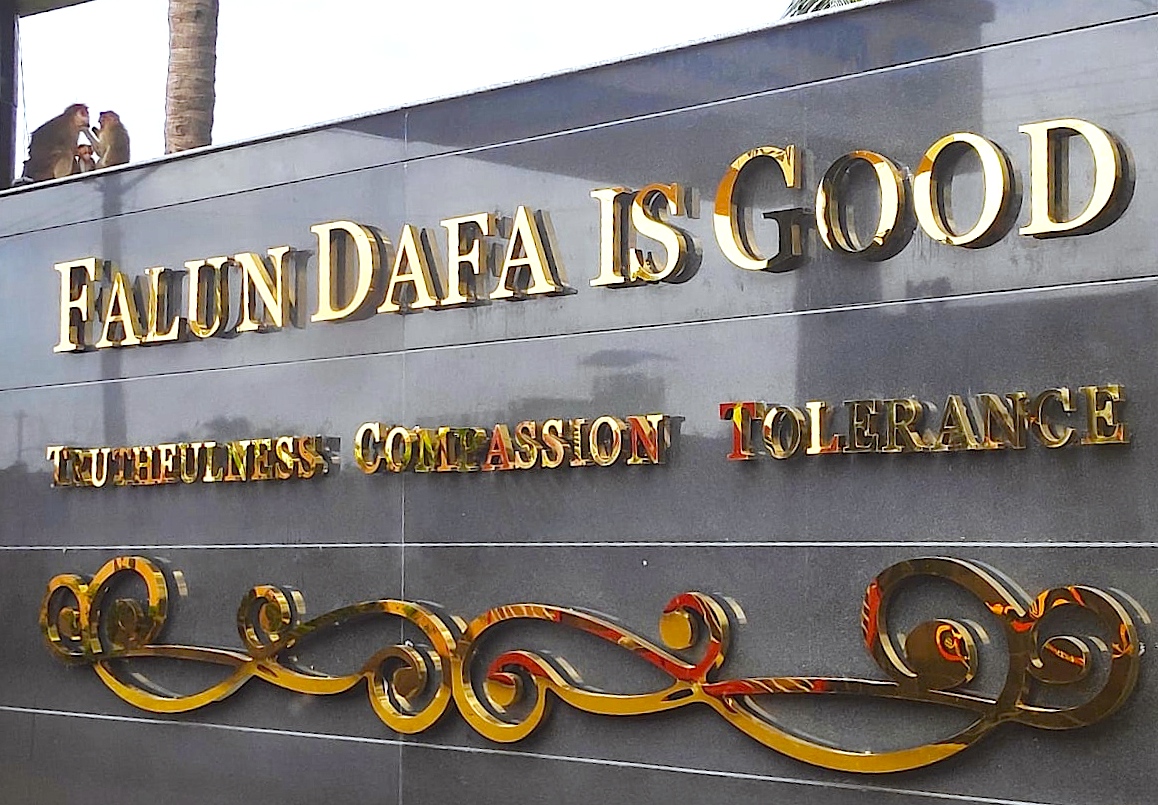 来到学校,只见学校大门口的右墙上,醒目的镶金英语大字“法轮大法好”印在墙上,下面是三个镶金字“真善忍”。