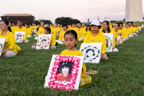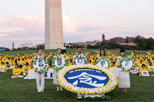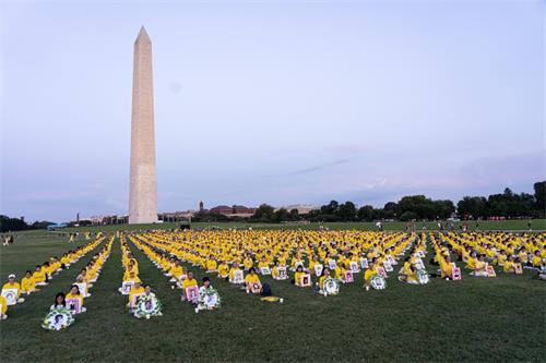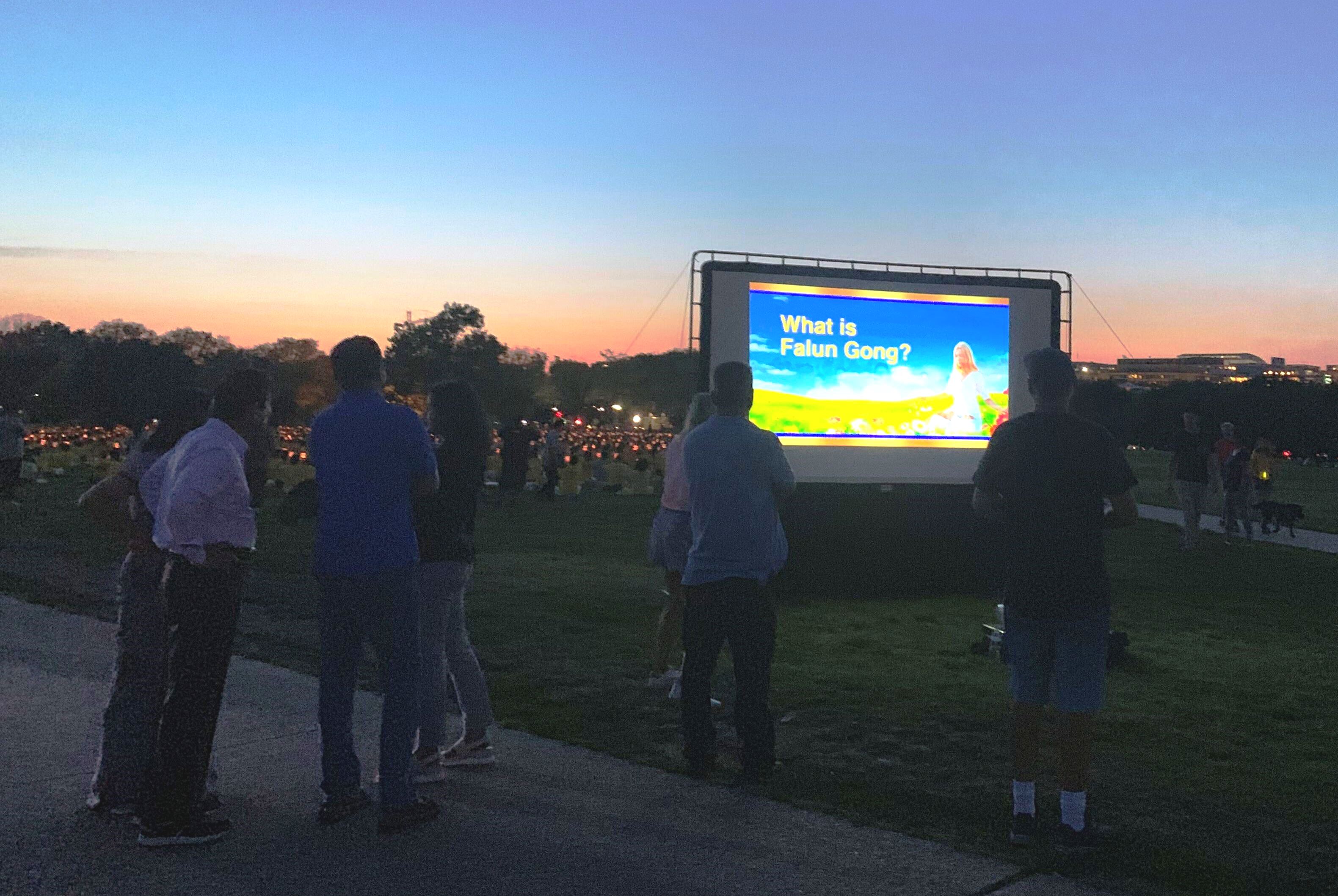 白天的潮热有所减轻,游客和当地的居民在华盛顿纪念碑下散步、跑步、骑自行车、或与朋友家人聊天。这时一群穿着黄色T恤衫的人们整齐地在草坪上排开。舒缓优美的音乐开始播放。开始时天还没有完全黑。这样的景象和音乐吸引了很多人驻足观看。今年法轮功学员还设立了一个屏幕,在屏幕上轮流播放不同的画面和简单信息,如“悼念被中共迫害致死的法轮功学员”,“法轮功烛光守夜”,“为什么迫害会发生”等。