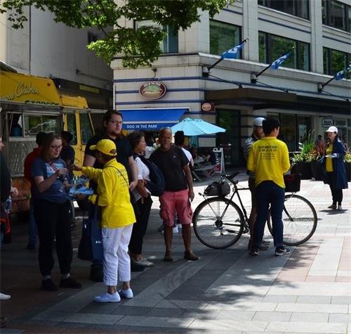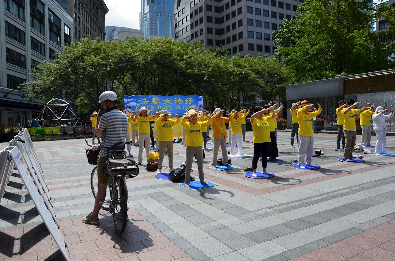 【明慧网二零一九年七月二十日】二零一九年七月十三日,在“七二零”反迫害二十年之际,美国西雅图法轮功学员在市中心的西湖公园(Westlake Park)举行集会。当地的法轮功学员摆放展板,悬挂横幅,进行功法展示,向路人发放真相资料,吸引了大批西雅图当地居民和游客了解真相,部份学员也回顾了他们二十年的正法历程。