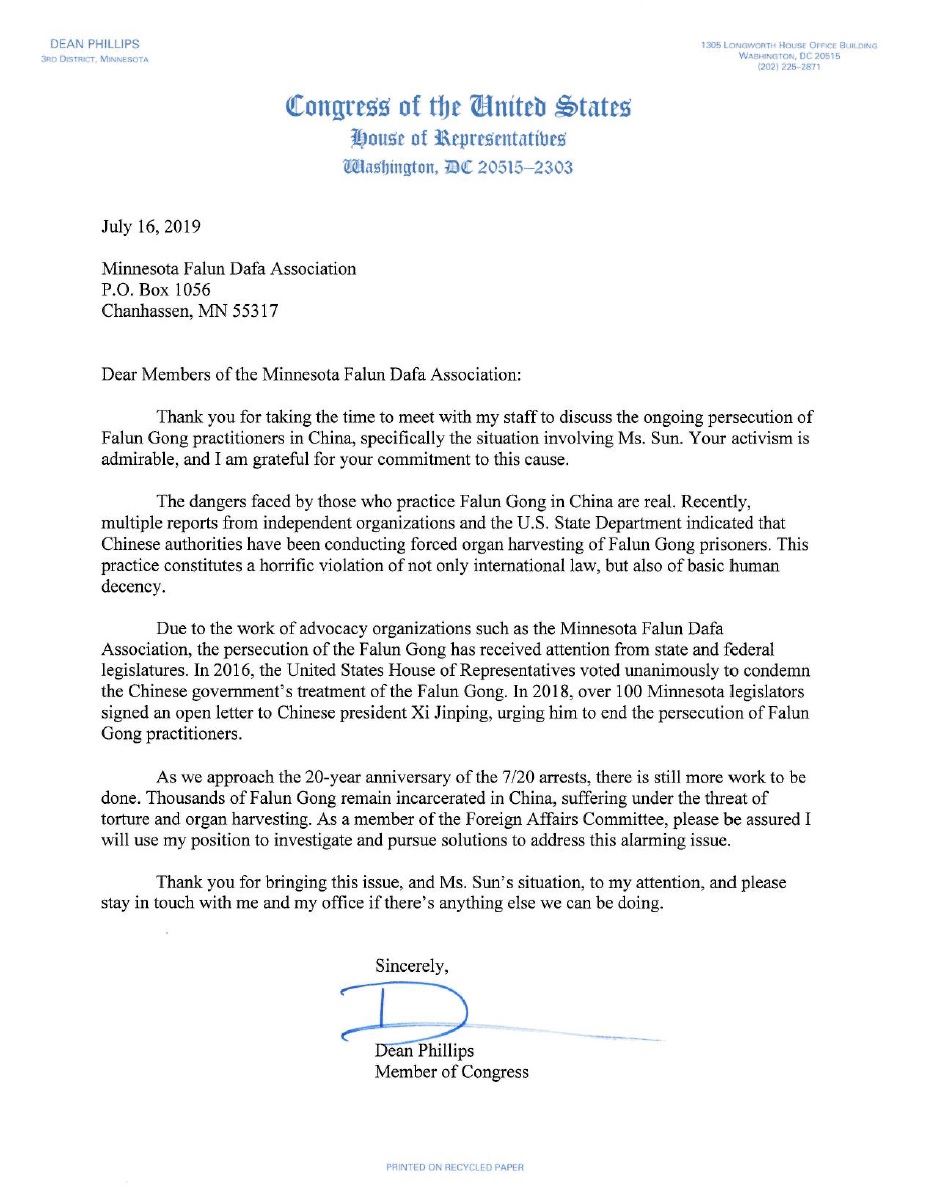 ![]() 图1:美国国会议员迪恩·菲利普斯(Dean Philips)致信明尼苏达州法轮大法学会,关注法轮功学员遭受中共迫害的情况。 |