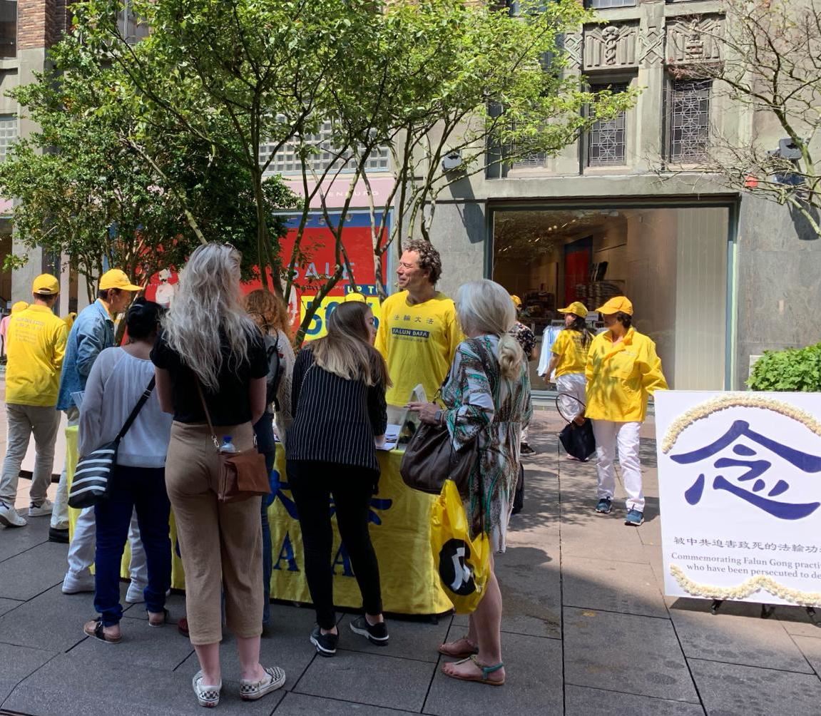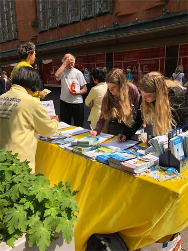 在海牙中领馆前集会结束后,法轮功学员来到海牙市中心人流密集的商业街,向过往的人讲真相、发传单、展示功法,征集诉江反迫害签名。很多人了解真相后在征签表上签名。