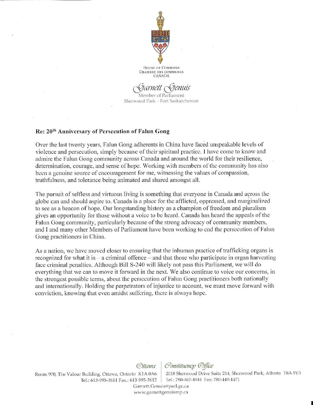 '图14:加拿大联邦国会议员杰纽益斯(Garnett Genuis)的支持信'