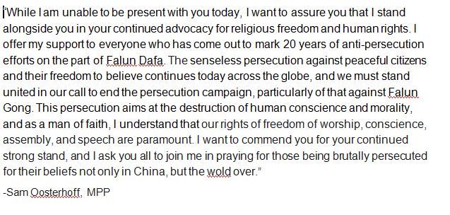 安省议员奥斯特霍夫(Sam Oosterhoff)来信说:“我今天无法与你们在一起,但我想向你们保证,我会与你站在一起,继续倡导宗教自由和人权。”他说, “我向所有出席纪念法轮大法20年反迫害活动的人表示支持。”