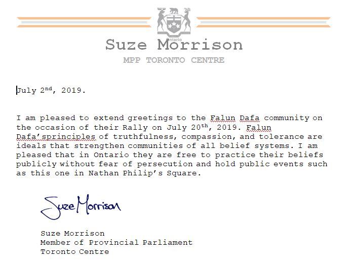 安省省议员莫里森(Suze Morrison)给2019年7月20日的集会发来支持信。“法轮大法的原则‘真、善、忍’,是加强所有信仰体系社区的理想原则。我很高兴法轮功学员在安省可以自由​​、公开地实践他们的信仰,不必担心受到迫害。”