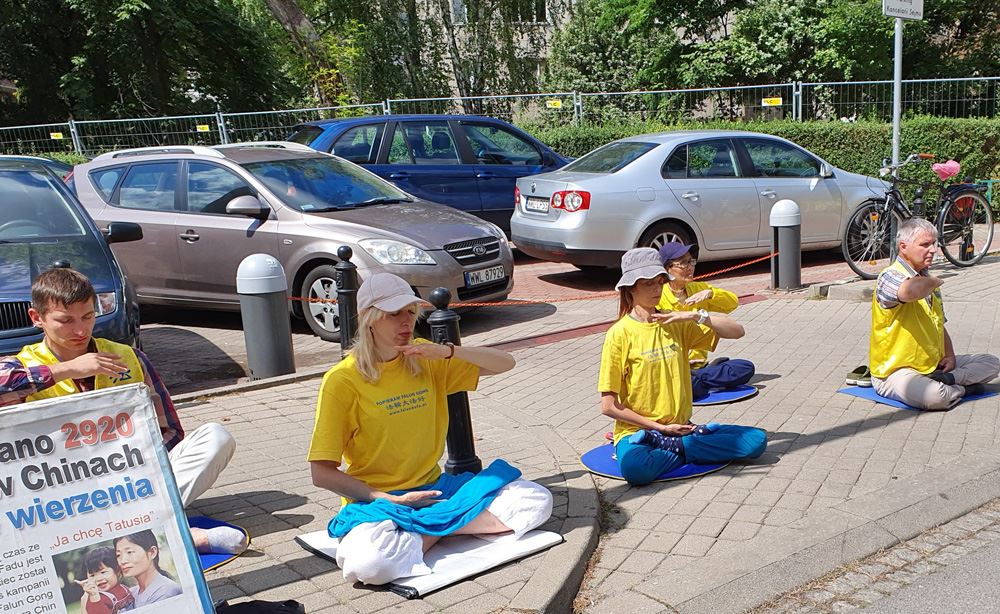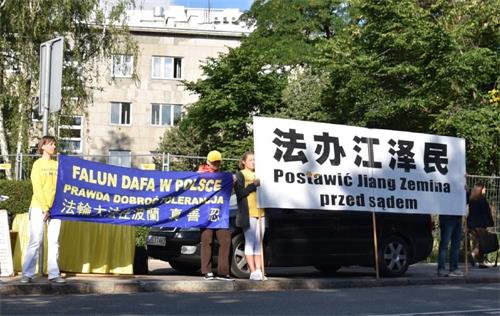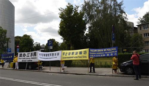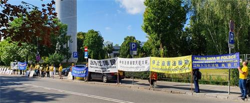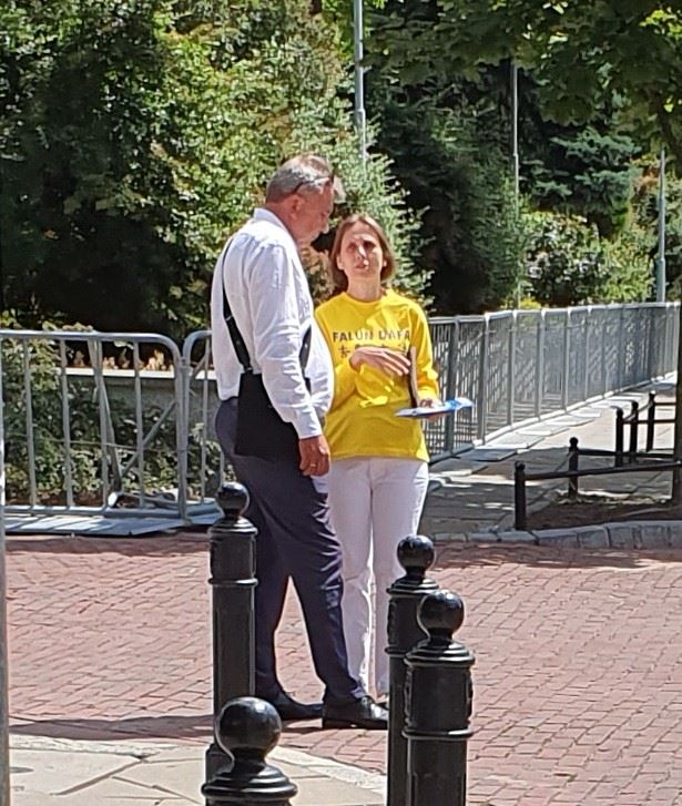 法轮功学员在议会楼外散发真相传单,揭露中共二十年来对法轮功的残酷迫害及活摘器官的反人类罪行;法轮功学员也向议员们及过路行人展示法轮功的五套功法,介绍功法特点及祛病健身、使人道德升华的功效。法轮功学员代表在现场发表声明,呼吁和希望波兰政府和议员们为制止中共迫害法轮功做出共同的努力。