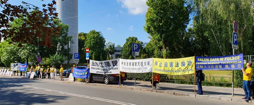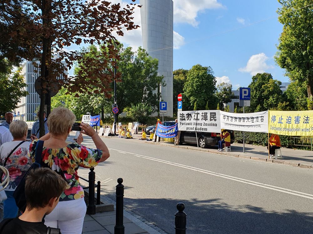 【明慧网二零一九年七月二十一日】二零一九年七月十八日早晨七点,波兰华沙议会楼前聚集了来自波兰各地的法轮功学员,他们手持横幅静立街边,三十多米长的路边摆满了中、波、英三种文字的法轮功真相展板。很多前来上班的议员及络绎不绝的观光者都注意到了条幅上的信息:“法办江泽民”、“停止迫害法轮功”、“中共活摘器官天理难容”、“法轮大法好”等。