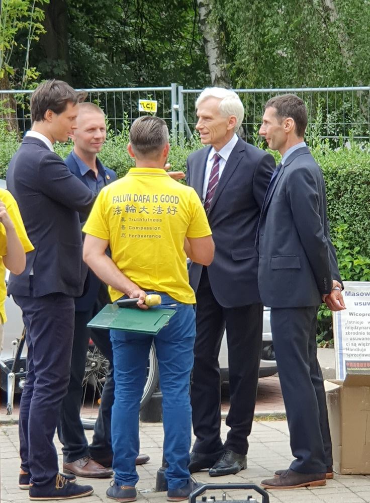 波兰议员Marcin Święcicki先生到现场,与法轮功学员交谈许久,并发表讲话。
