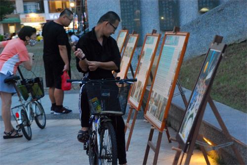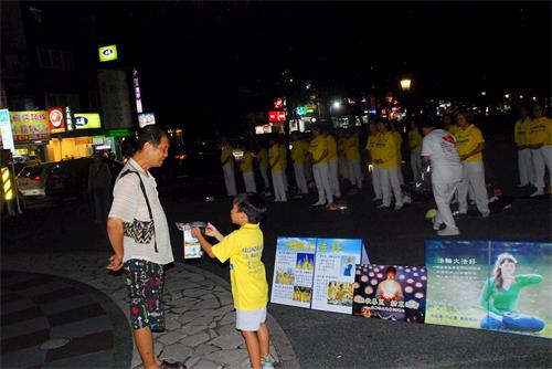 法轮功学员徐小姐向看真相展板的游客解释说:“今天是很特别的日子,一九九九年中国大陆开始迫害法轮功,已有二十年,我们要让台湾民众知道,因为法轮功太好了,修炼人数太多了,却受到打压,这么好的功法,修炼真善忍是好的事情,应该让更多人了解,做好人难道还有错吗,所以我们用和平的炼功方式,用展板展现,让台湾民众理解。”