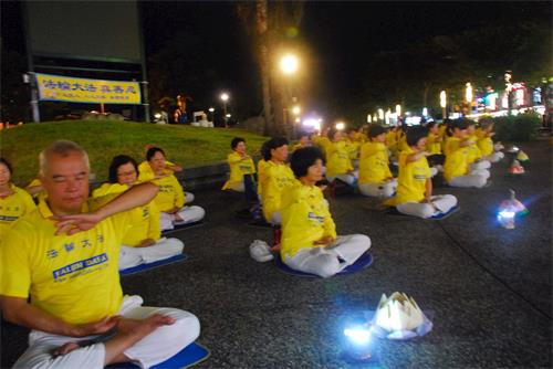 华灯初上,法轮功学员演炼五套功法后,队伍旁边摆着莲花灯,学员手举蜡烛,悼念被迫害致死的法轮功学员,场面肃穆感人。