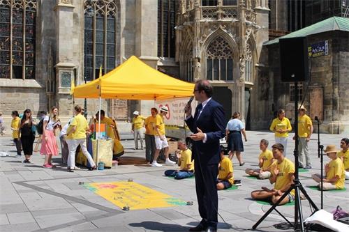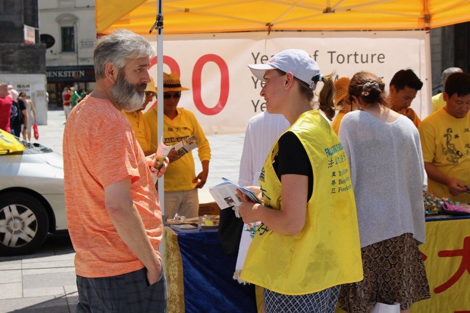 法轮功学员格雷戈尔(Gregor)是特地从斯洛文尼亚来奥地利参加这个活动的。他在真相点向民众发言中讲到自己的修炼历程。六年前,他刚刚开始修炼时,正处在自己人生的低谷中:婚姻离异,不能探望孩子,失业,还被检查出得了绝症。接触过很多气功后,他找到了法轮功。他说:“我读了《转法轮》这本书之后就知道,我要修炼法轮大法。”“从此,我几乎每天炼功,我的生活也发生了很多转变。当我遇到困难和矛盾时,我把注意力放在好的一面,并尽力保持慈悲的心态。就这样,我的疾病消失了。我什么不舒服的感觉都没有,我的医生也检查不出疾病了。法轮大法给了我新生!”对于中共的迫害,他告诉民众,当他知道这件事时:“我很震惊,觉得无法理解。”