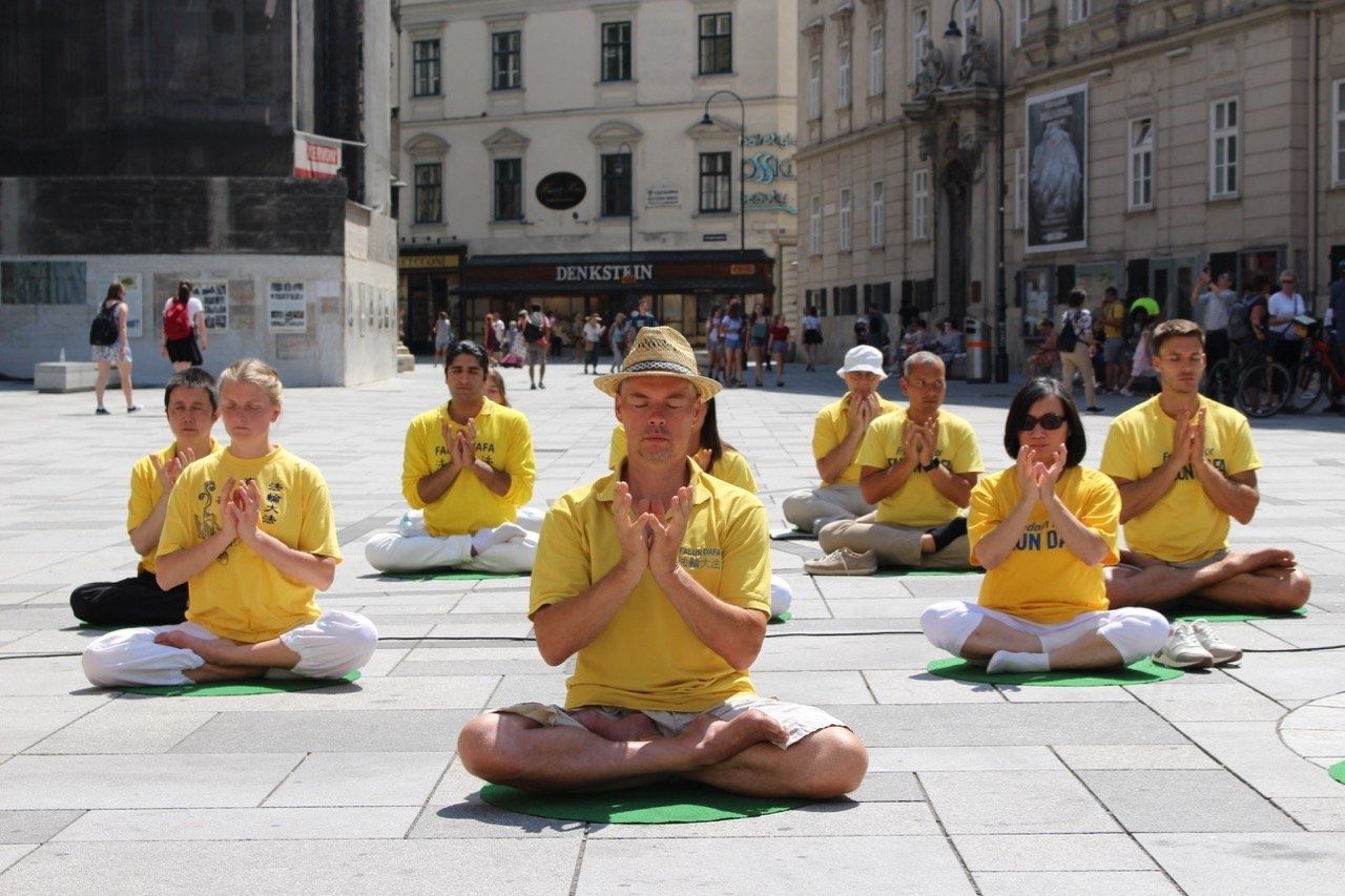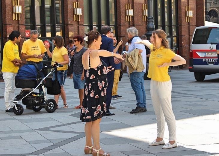 学员们在演示功法时,不少路人都被炼功场平静,祥和的氛围吸引,纷纷向学员们了解法轮功。一位来自南蒂罗尔地区的女士表示“打坐时响起的钟声”对她很有触动。一位来自委内瑞拉的女士说:“欧洲人的压力很大,是我们南美洲的人没有的。(你们这里的)平静对人很有益,对人的内脏和大脑都有好处。”一位女士表示感受到“很强的和谐的能量”,并决定学习打坐。还有一位男士告诉学员,自己很忙,压力很大。他特地停在了学员们的附近,因为他觉得炼功的音乐对自己的精神有好处。