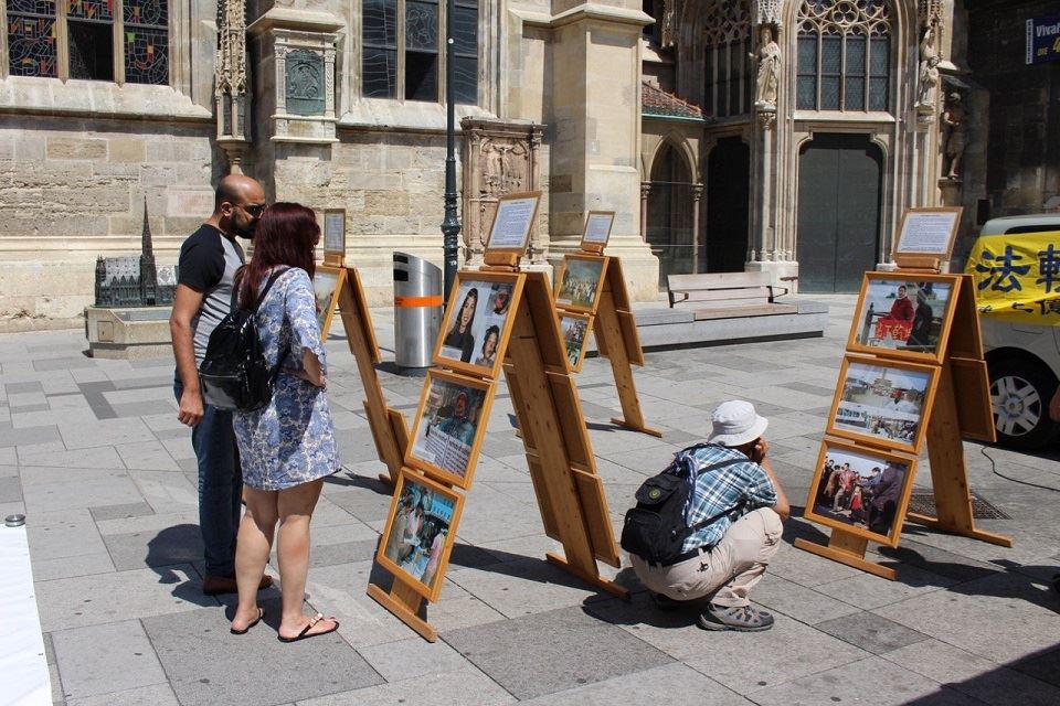 ![]() 图3~4:法轮功学员们于七月二十日在斯蒂芬大教堂前的广场上设立真相点,向民众传播真相。 |
