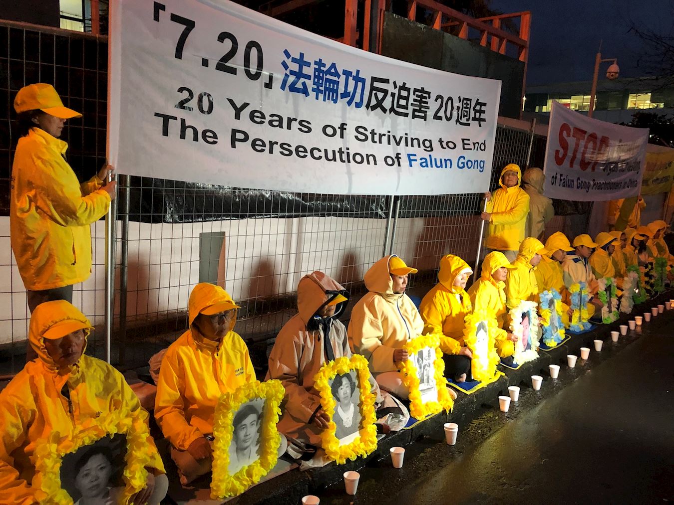 【明慧网二零一九年七月二十二日】(明慧新西兰记者站报道)二零一九年七月十九日晚上,新西兰奥克兰部份法轮功学员来到中领馆前,点燃盏盏烛光,悼念被中共迫害致死的法轮功学员,呼吁停止迫害。学员们冒着沥沥细雨,顶着阵阵寒风,场面庄严肃穆,只见过往的车辆,鸣笛致意,表示支持。