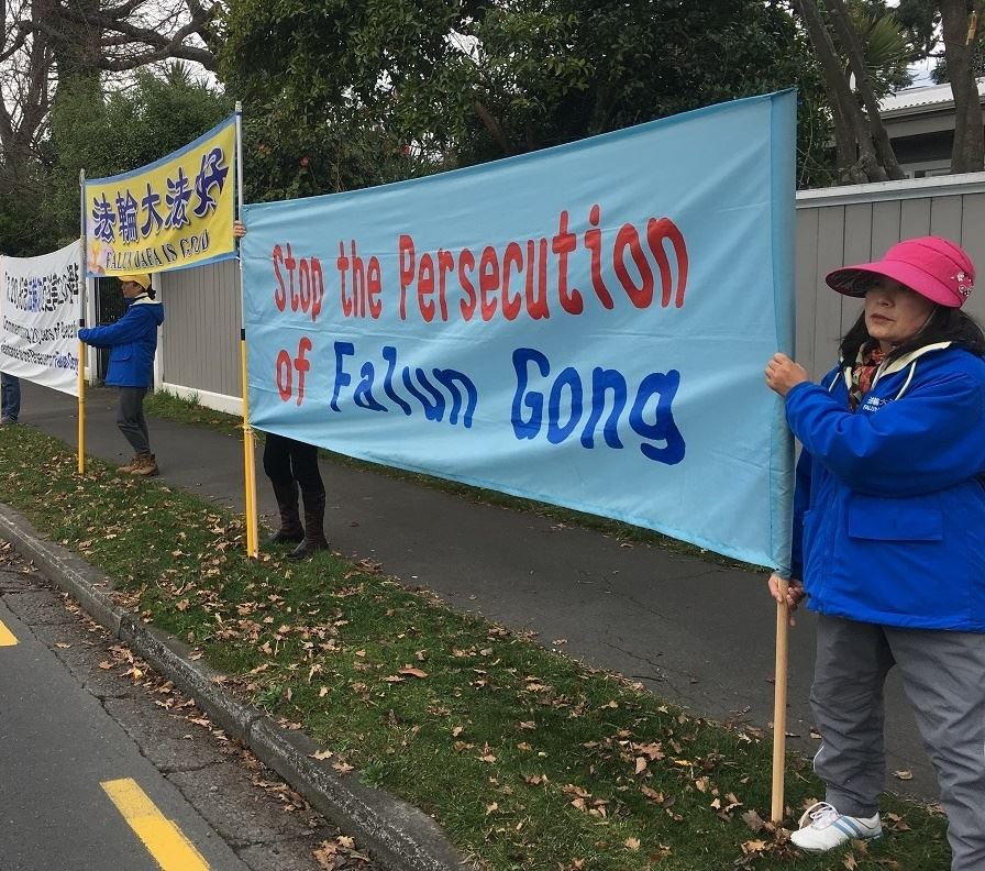 二零一九年七月份以来,新西兰基督城法轮功学员也多次到中领馆门前集会炼功,向人们展示平和优雅的法轮功功法,揭露中共对法轮功学员的血腥迫害,唤醒民众的正义良知,呼吁共同制止迫害!学员们打出“停止迫害法轮功”、“法轮大法好”等横幅、“法轮大法洪传世界”、“中共酷刑”等展板。
