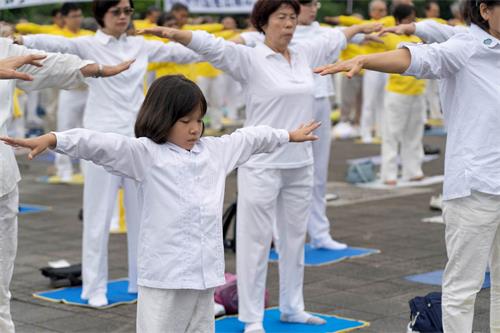 '图4~7:二零一九年七月二十日,高雄法轮功学员聚集在凤凌广场,举行法轮功反迫害二十周年集会活动。图为法轮功学员宁静祥和的功法演示。'