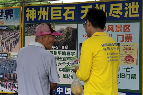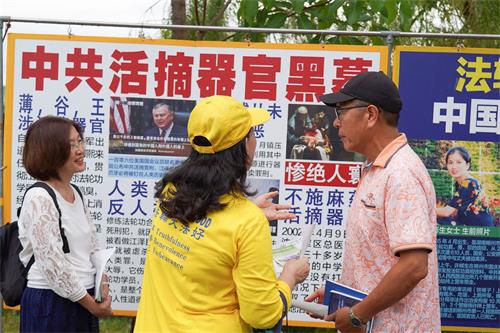 '图10~13:二零一九年七月二十日,高雄法轮功学员聚集在凤凌广场,举行法轮功反迫害二十周年集会活动。图为真相图片展、反迫害征签。不少过往民众驻足关注。'