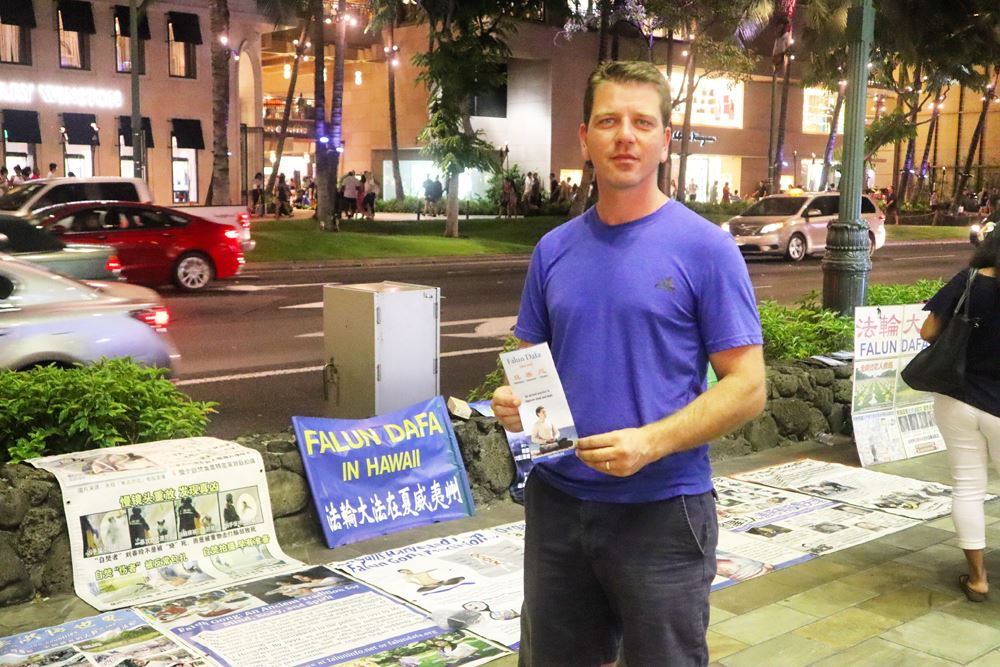 罗伯特·科特罗(Robert Quartero)是夏威夷当地的西人法轮功新学员,他出生在夏威夷欧胡岛,之前是一名消防员,现在已经退休,但依然忙碌各种生意。他说自己是通过妻子接触的法轮功,他对信仰一直在追求,是很注重“灵性”(Spirituality)的人,终于幸运的等到法轮功,了解了法轮功后,这令他感到自己多年的追求和法轮功中的道理在精神层面相当契合,法轮大法解开了他多年不解的各种疑问,有了全新的令人信服的答案。他表示:法轮功是具有包容力的,全世界人无论肤色民族、宗教信仰有多么不同,都可以修炼法轮功。