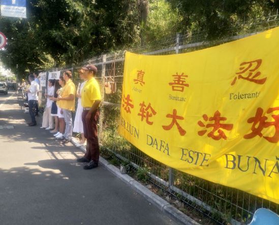 ![]() 图1~2:罗马尼亚法轮功学员在中使馆前抗议中共迫害 |