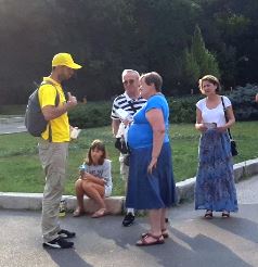 之后,法轮功学员们来到中领馆旁边的Herăstrău公园讲真相和集体炼功。这个公园是布加勒斯特最大的自然保护区公园,也是各个国家来罗马尼亚游玩的旅客的必游之地。法轮功学员们在该公园的地铁口摆上真相展板和条幅,向过往行人发资料,揭露中共持续迫害法轮功的真相并向大家展示功法。