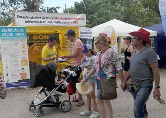 七月二十日,德国卡斯鲁尔地区的学员在歌允特-克罗兹设立真相点,拉开横幅,向前来参加家庭日的游客讲述发生在中国的迫害事实。