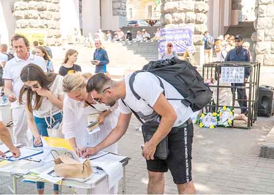 在二十年反迫害之际,乌克兰主要城市法轮功学员举行反迫害活动,民众签名反对中共迫害“真善忍”,声援法轮功。