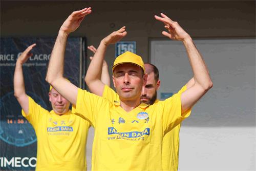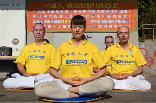 图1~3:苏黎世中领馆附近,法轮功学员向路人展示五套功法