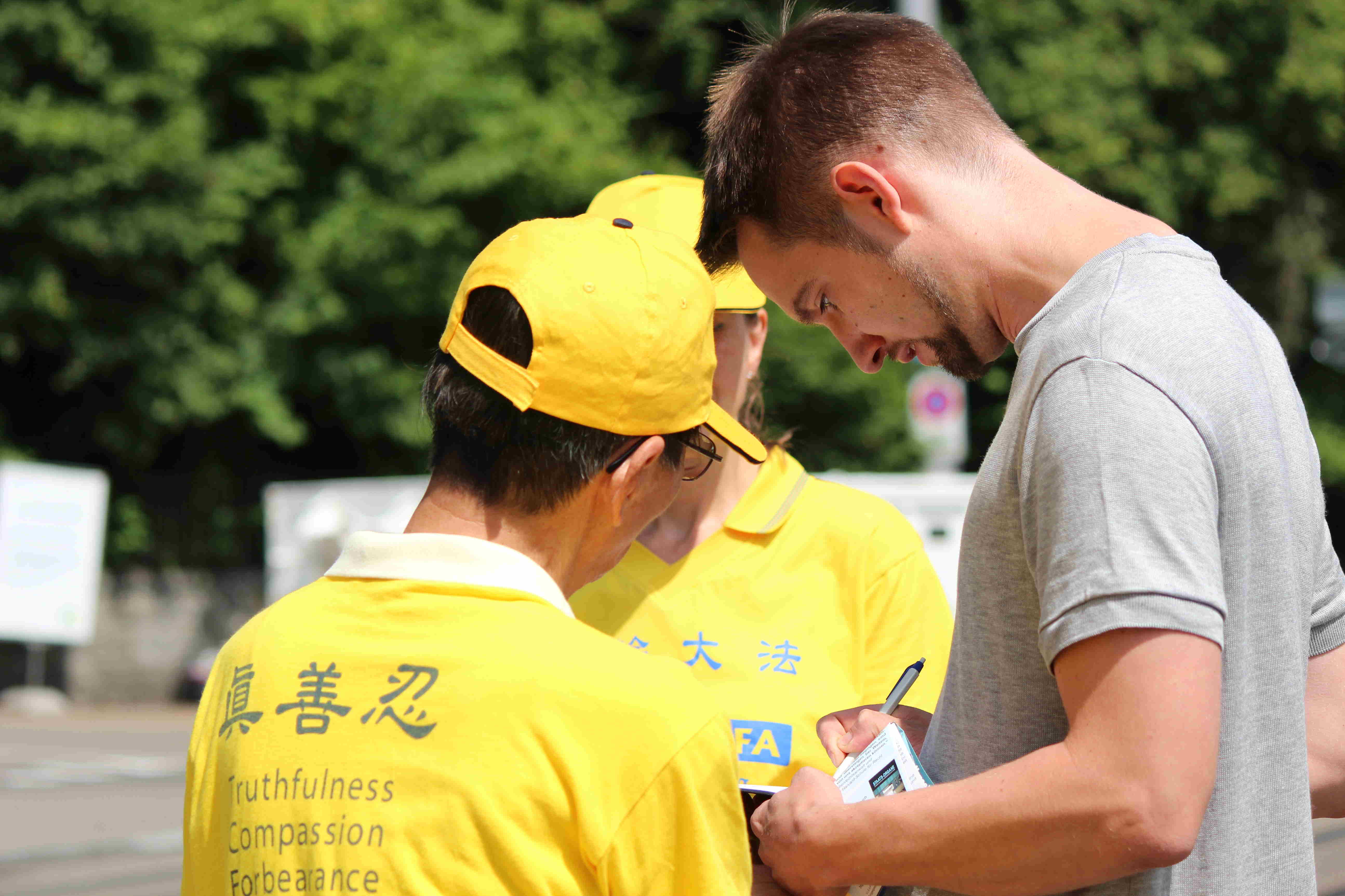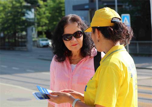 艾芙琳·叶吉(Eveline Jaeggi)是一位教育工作者,她在签名后还和法轮功学员谈了很久。她谈到:“很遗憾,我今天才第一次听说这场迫害,二十年,太久了,迫害应该立即停止,根本就不该发生!摧残如此美好的功法,并因此迫害民众真是太糟糕了!”她要去了解更多的法轮功的讯息,并打算尝试学炼功法。