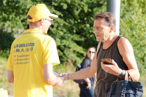 有的中国游客谈到自己经常会在邮件信箱里收到关于法轮功的讯息,所以对此并不陌生;有的主动来拿中文资料,有的愿意退出曾加入的中共组织……