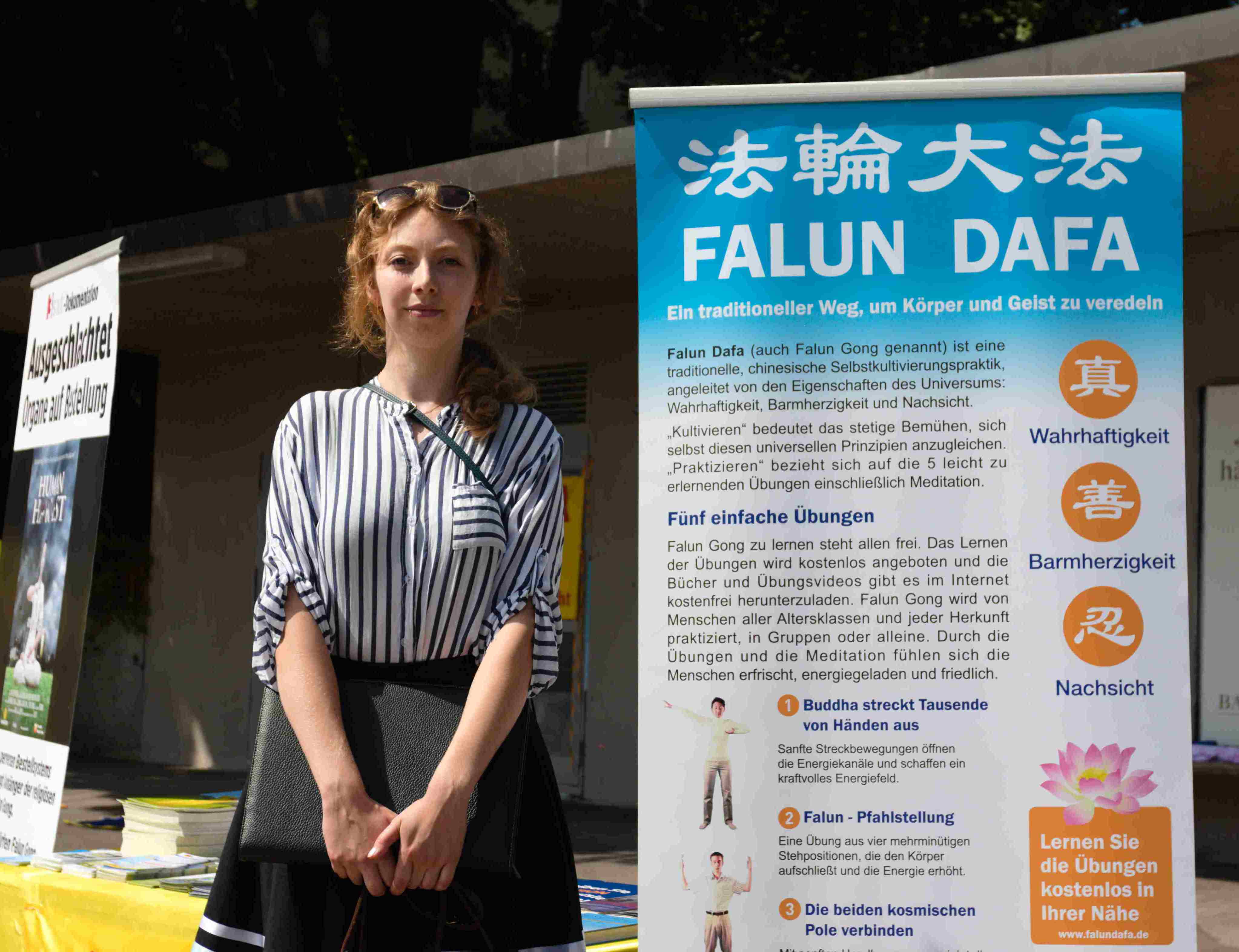 从事护理工作的佩特拉(Petra)正在寻找适合自己的锻炼方法,当她在卢塞恩偶遇法轮功学员的信息摊位,和学员交谈后,她认为自己找到了。她向学员询问关于法轮功的详细信息,并购买了《转法轮》一书。