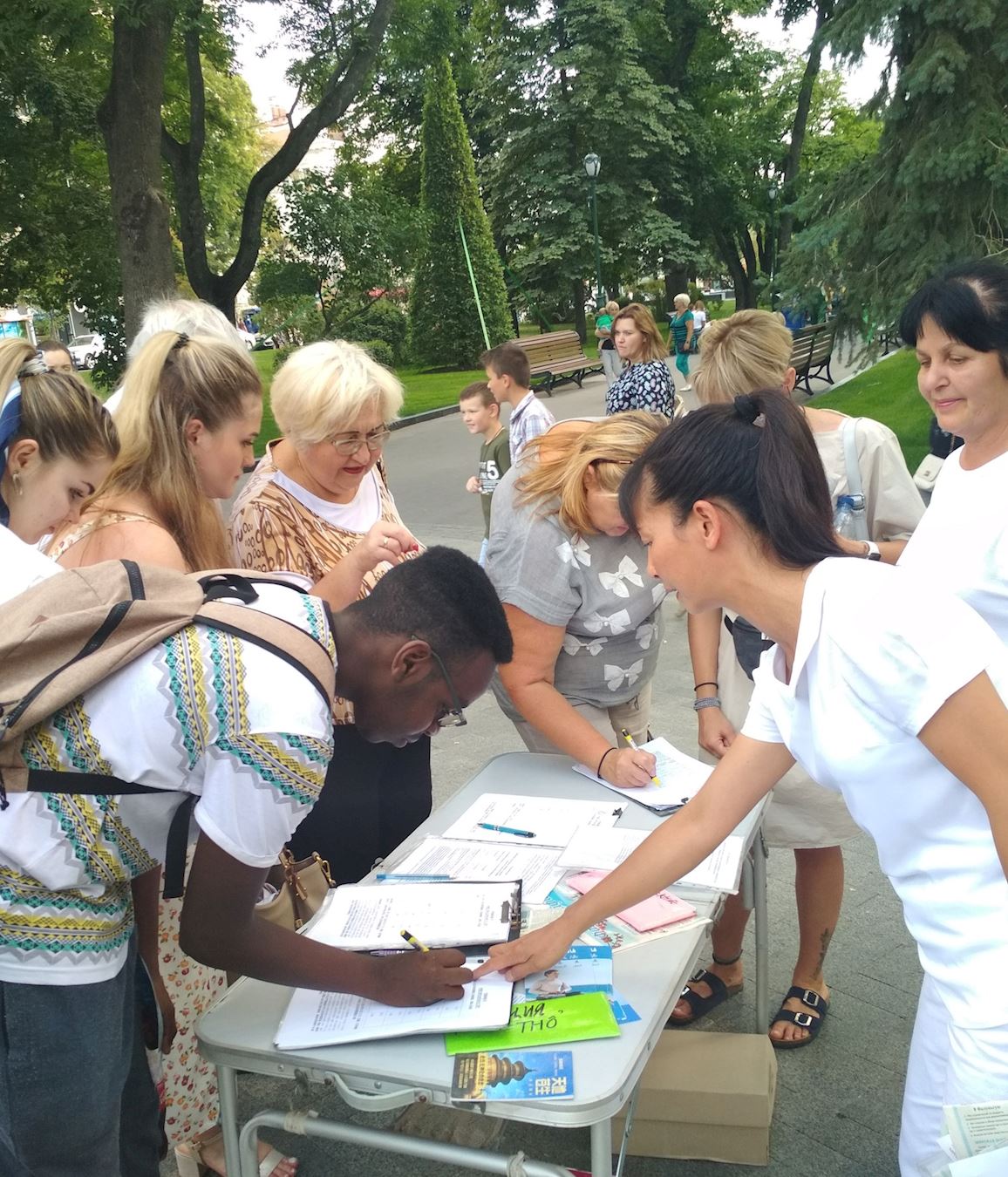 七月二十日,乌克兰第二大城市哈尔科夫市大法弟子在市中心公园举行反迫害活动。不少市民及游客明白真相后,签名反对中共迫害,声援法轮功。