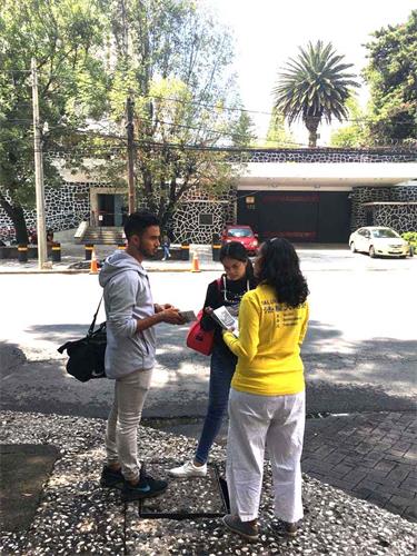 七月十九日,法轮功学员在墨西哥城中共领事馆外集会,炼功、讲真相。