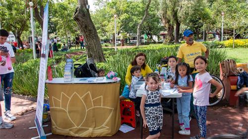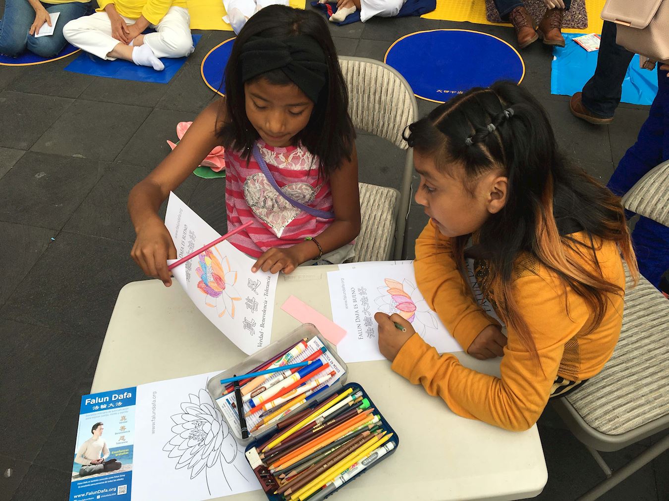 有两个小女孩向路人出售蛋白甜饼。一名学员向她们介绍大法,她们很快就迷上了学画莲花。