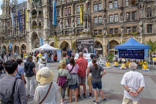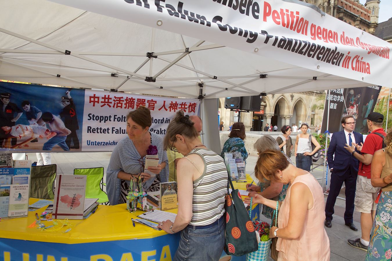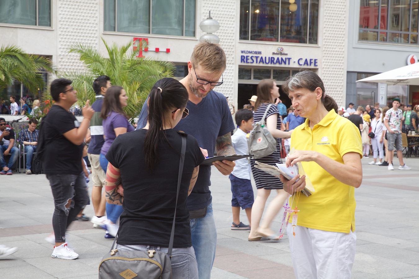 活动中,学员的功法演示向人们展示法轮功的美好,大型横幅向中国游客传递信息,法轮功弘传世界、揭露中共活体摘取法轮功学员器官、退出中共的重要性等信息,希望他们能远离中共,为自己创造出美好的未来。了解真相的人们纷纷签名上书德国政府,敦促德国政府帮助制止中共迫害法轮功。