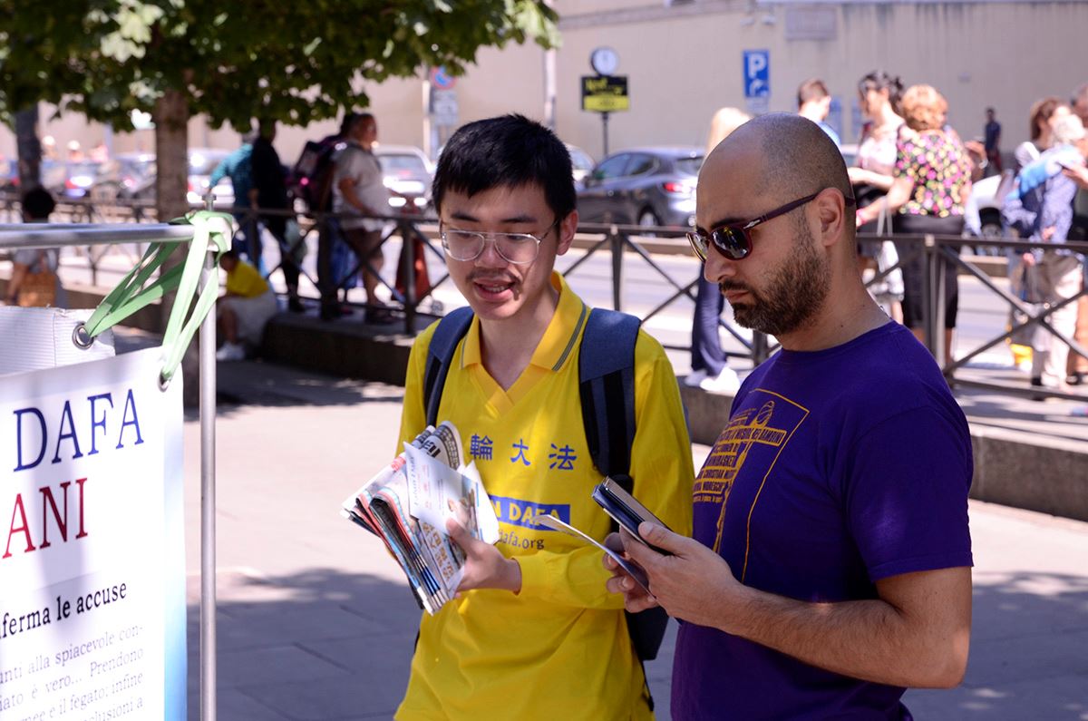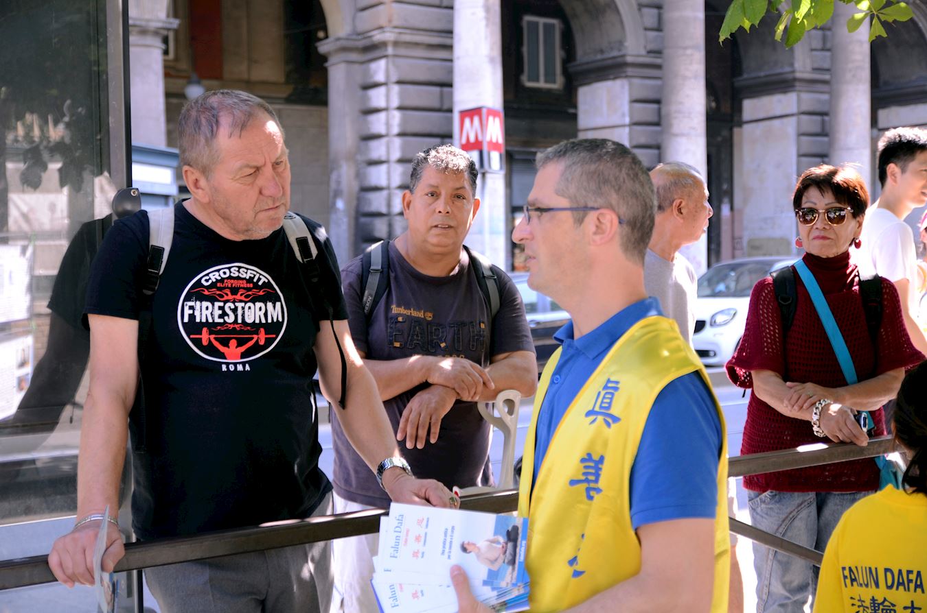 二零一九年七月二十日是法轮功反迫害二十周年,上午,在罗马维多利奥广场(Piazza Vittorio Emanuele)开展了法轮功反迫害二十周年活动,罗马维多利奥广场位于罗马华人中国城的中心地带,是当地华人聚集的地方,活动期间许多民众驻足了解,表示支持法轮功学员,也有不少人对功法表现出很大兴趣,表示要去炼功点学功。