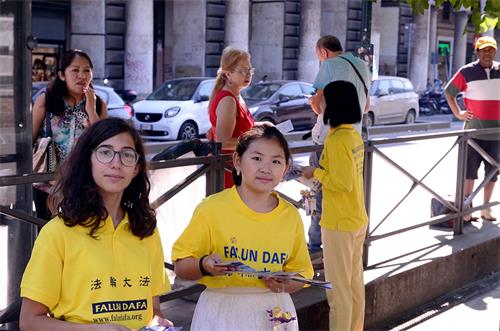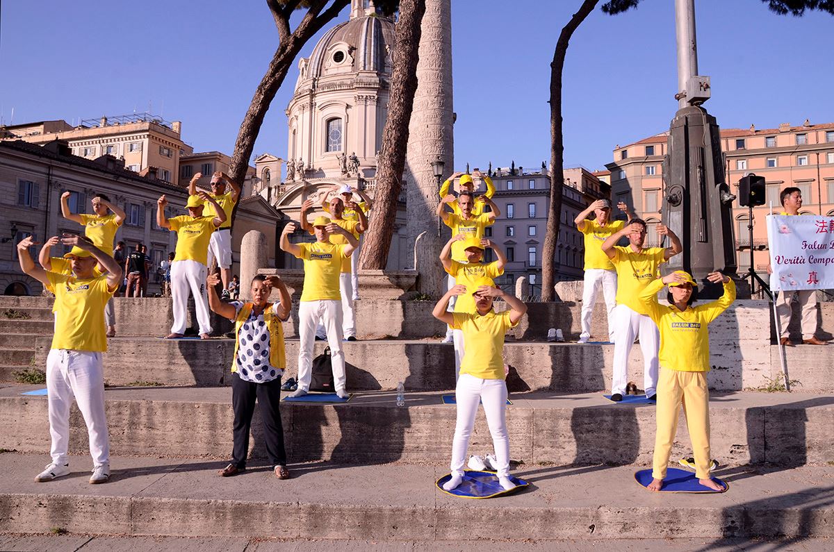 【明慧网二零一九年七月二十四日】二零一九年七月二十日、二十一日两天,意大利全国各地的法轮功学员聚集到首都罗马,举办反迫害活动并召开全国修炼心得交流会。七月二十日当天,在罗马中心著名的威尼斯广场及华人区布置起大型横幅和真相展板向民众介绍什么是法轮功,及中共二十年来对法轮功的迫害。并在活动期间学员们炼功,现场演示五套功法展示大法的美好,祥和。