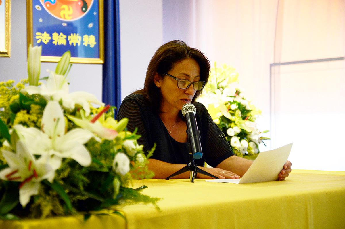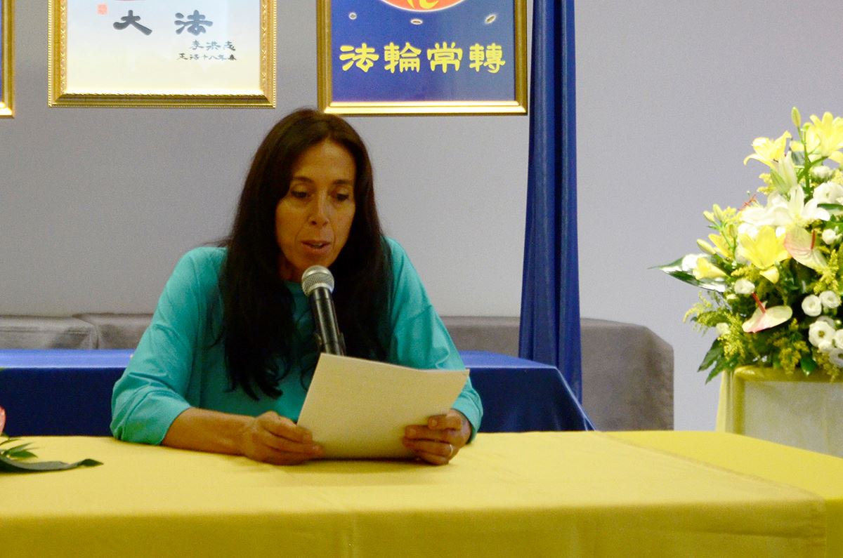 图13:来自佛罗伦萨的画家蒂亚娜(Diana)交流了自己在推广和参加新唐人油画大赛期间的修炼过程
