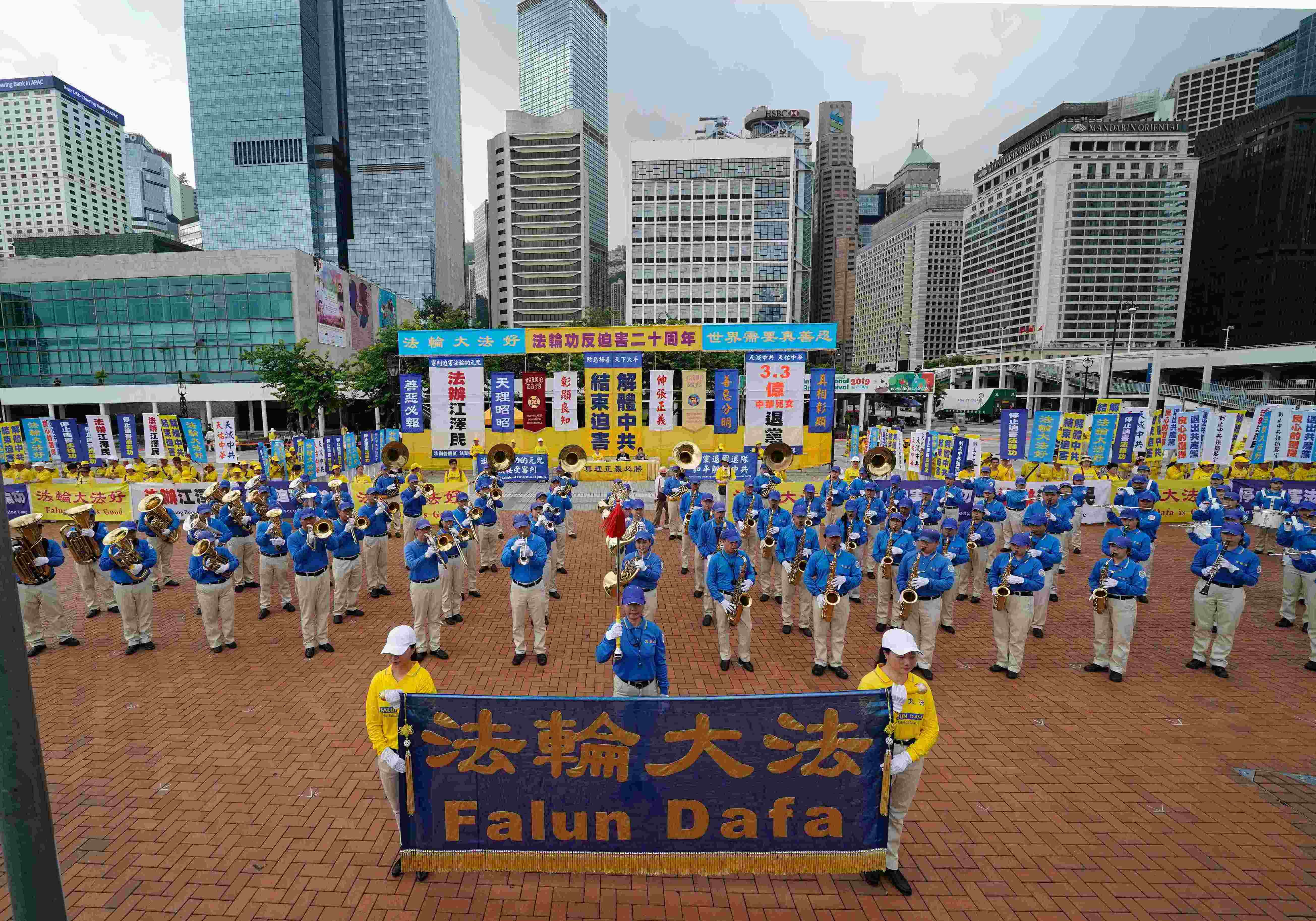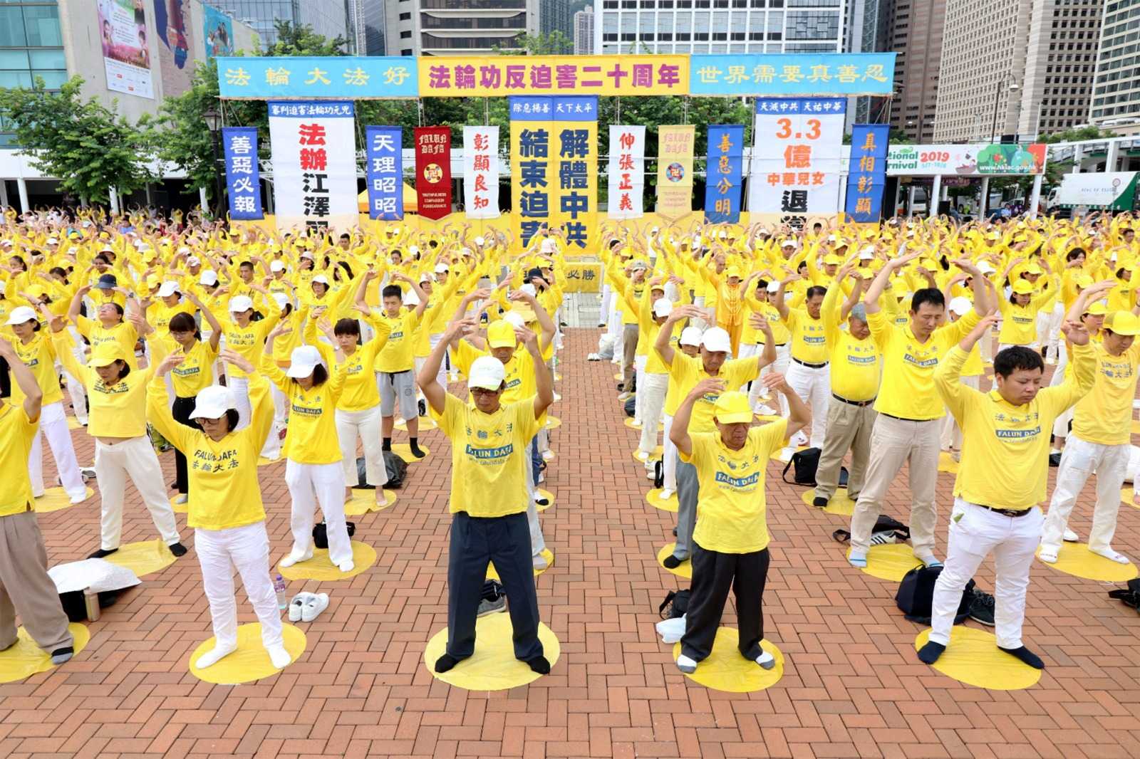 当天早上,来自香港及外地的法轮功学员在中环爱丁堡广场集体炼功。随后,法轮功反迫害二十周年集会在上午九时半举行。