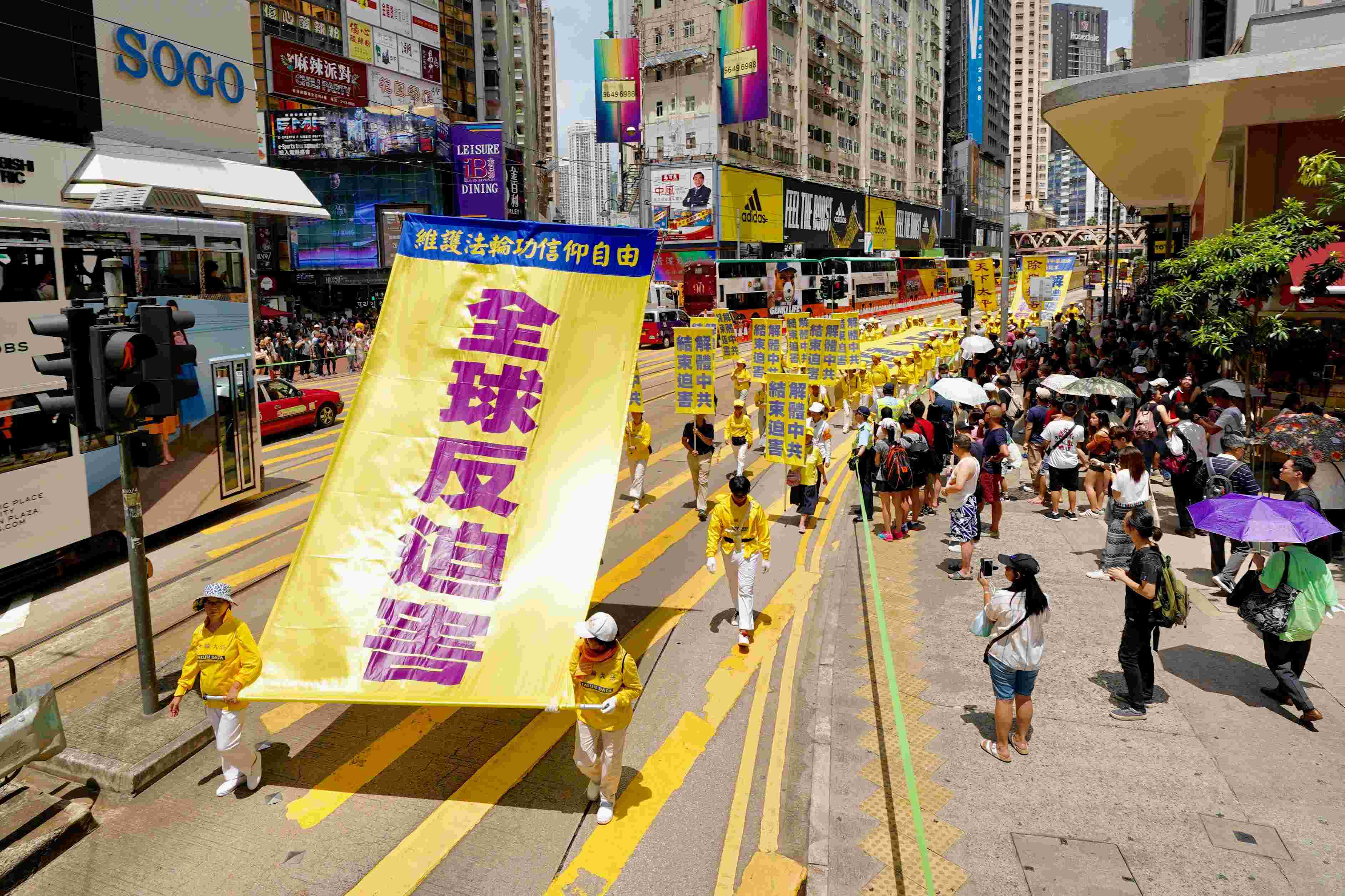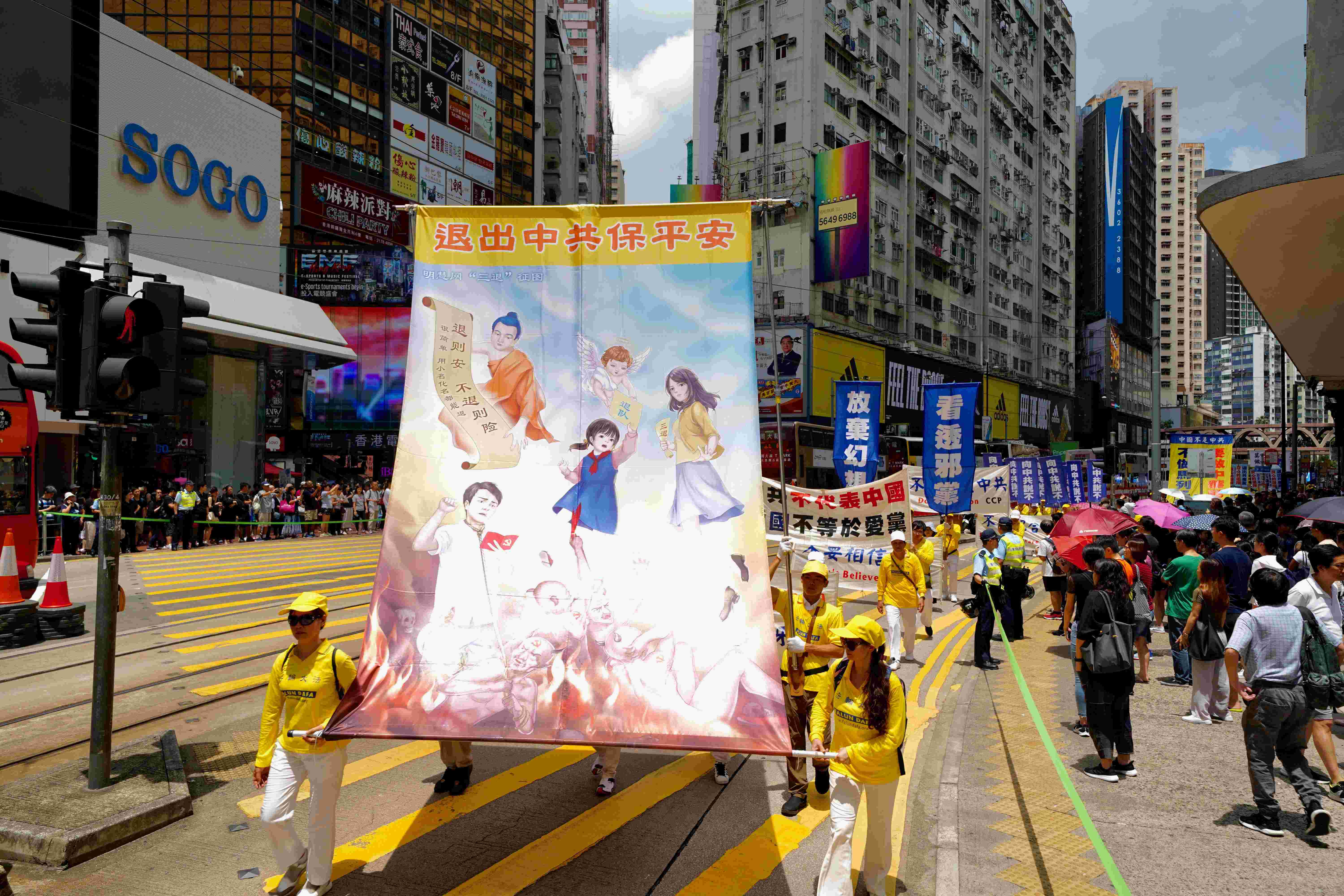 中午十二时半,过千人的游行队伍,在天国乐团的领头下从北角英皇道游乐场出发,途经铜锣湾、湾仔、中环等港岛区闹市,前往终点的西环中联办。庄严雄伟的游行阵列,沿途吸引许多中外民众驻足观看。有从深圳、广东、河北等地来港的大陆游客都是第一次看到法轮功游行,深感震撼,纷纷用手机拍下壮观的情景,准备带回大陆与亲友交流。