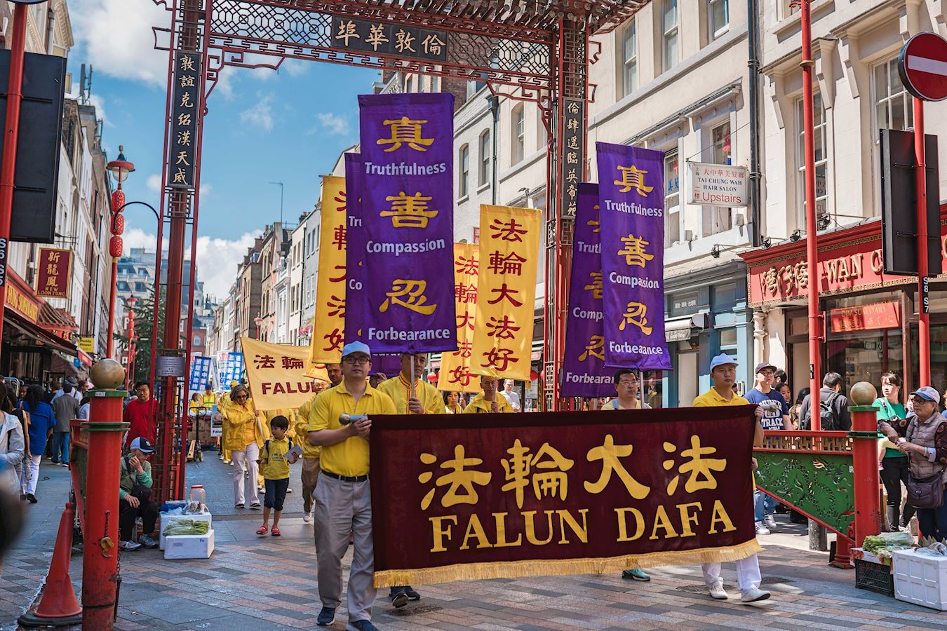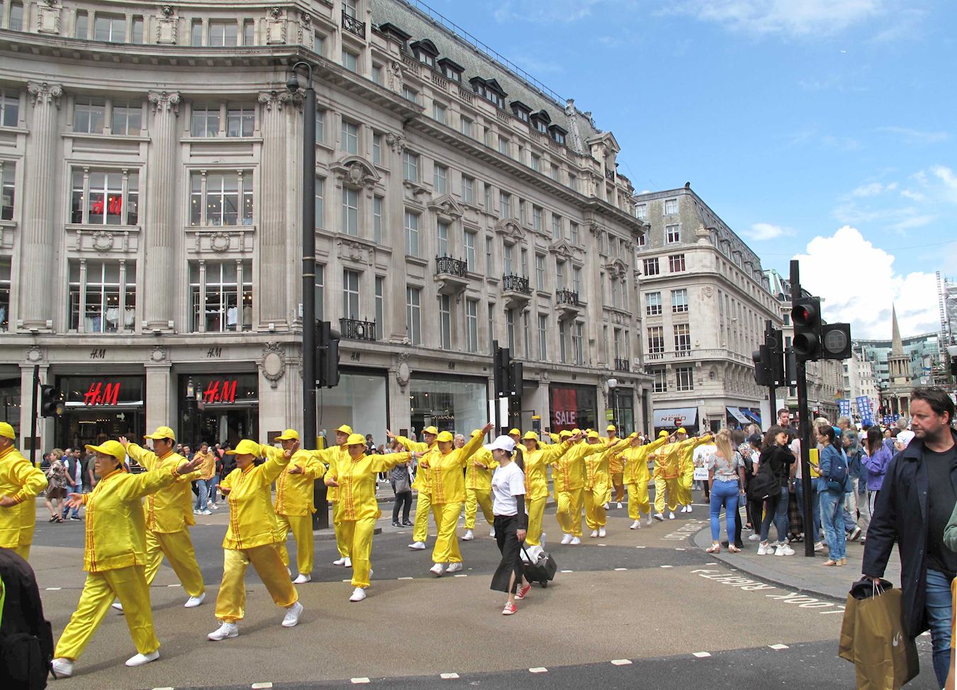 信息明了的真相横幅、舒缓祥和的功法演示、悼念被迫害致死法轮功修炼者的白衣方队,加上在游行队伍两侧发放法轮功真相传单并面对面讲真相的法轮功学员,“反迫害二十周年”游行队伍在伦敦市中心的人流中行进,传递真相、彰显正义、汇聚良知。游行队伍经过之处,不断出现被中共迫害法轮功真相所震惊的观众,仍有很多人表示第一次听说法轮功。“反迫害二十周年”游行队伍两次绕行伦敦唐人街,吸引更多中国人正视法轮功的目光,吸引那些对中国感兴趣的人开始关注法轮功。