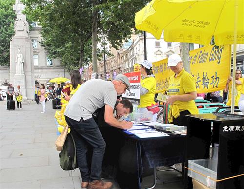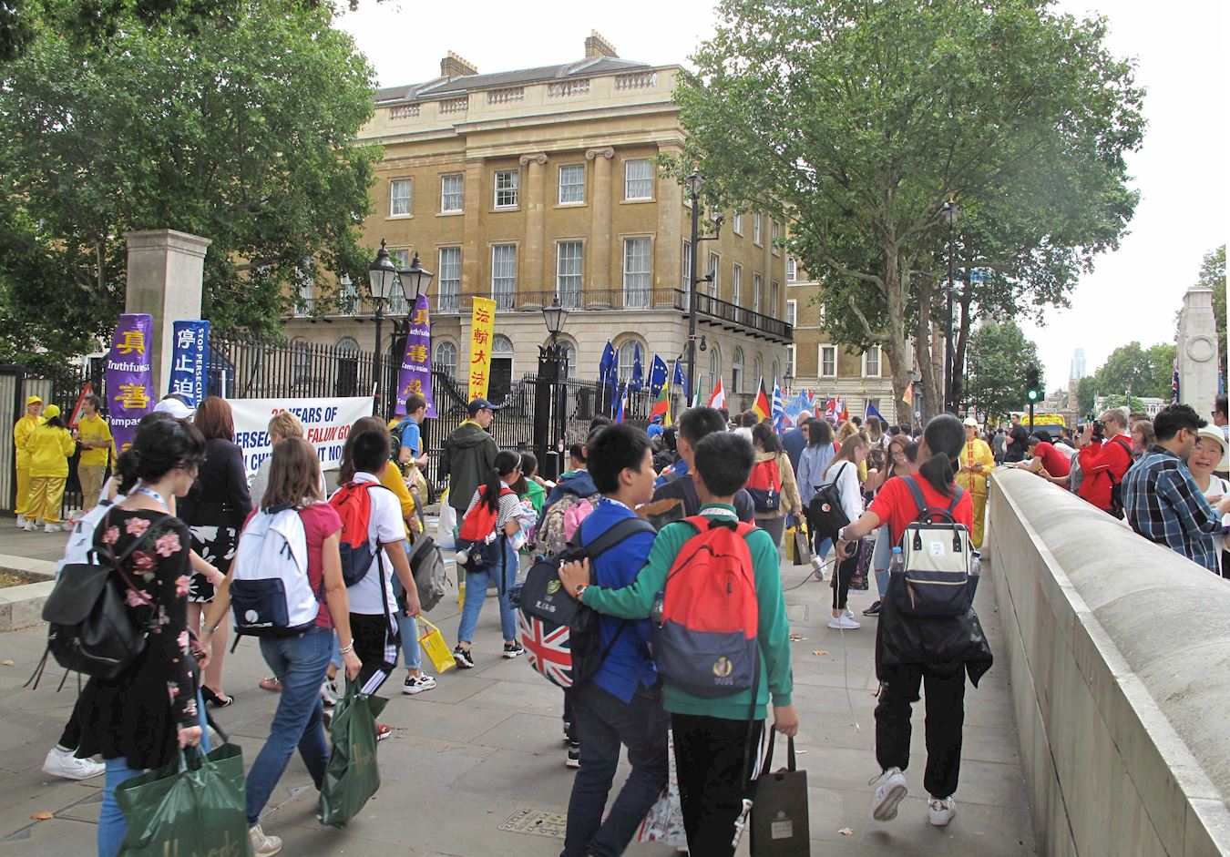 当天在英国首相府外白厅大街上有大规模抗议活动,法轮功学员平和的真相展示与反迫害信息吸引了众人目光,很多人接过传单,不断有人在反迫害征签表上签名。英国学员斯图尔特(Stewart)表示:“中共对法轮功的迫害是一场人间的悲剧,二十年太长,必须制止。”
