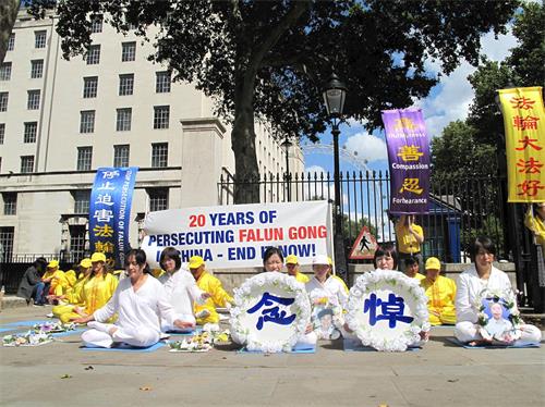 “真善忍”、“法轮大法好”、“停止迫害法轮功” 、“悼念”,醒目的信息、庄严肃穆的场景、宁静祥和的能量,法轮功学员“反迫害二十周年”纪念活动把真相摆放在英国首相府前宽阔的白厅大街(Whitehall)上。