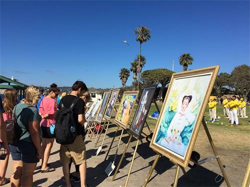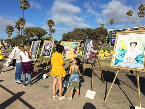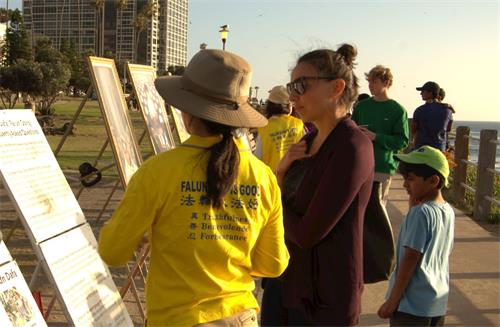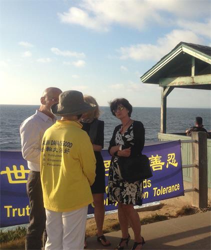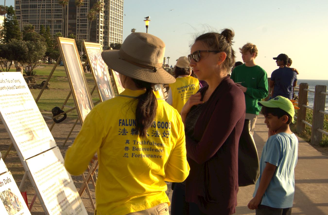 在美国生活了七年的华人毛女士与家人主动向法轮功学员要了真相资料,在加州大学圣地亚哥分校念书的三位中国留学生一边读着关于中共强摘法轮功学员器官的资料,一边与法轮功学员交谈,他们都表示,以前听的是共产党的宣传,现在想从不同的角度了解一下(法轮功)。