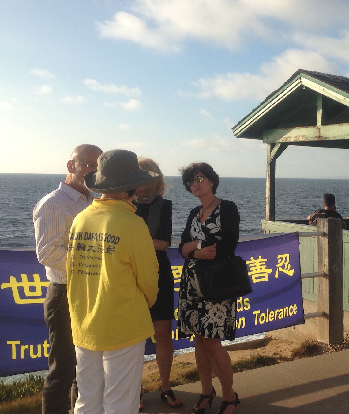 当天风和日丽,游人如织。在濒临大海的绿色大草坪上,身着黄T恤的法轮功学员平静祥和的炼功场景吸引了路人的目光;很多人认真地读着展板上的内容,并被反映法轮功学员修炼和反迫害的油画所感动。