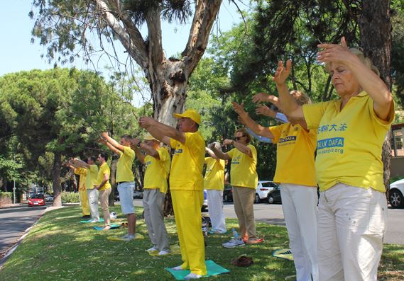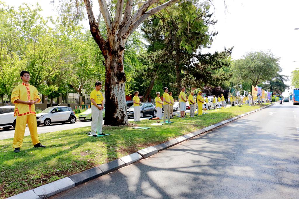 图10:2019年7月20日,法轮功学员在中共驻西班牙大使馆前炼功。