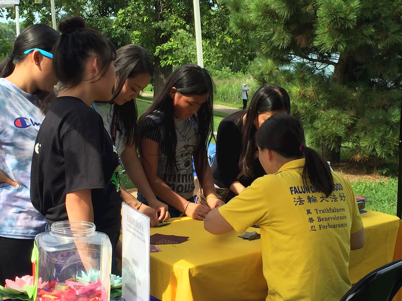 这是明州法轮功学员连续第十四年参与龙舟节活动。主办方今年格外支持法轮功学员,将大法的展位安排在靠近中心餐饮大厅、紧邻儿童游乐场的黄金位置,因此今年的展位格外热闹。与往年相比,今年大家普遍感到人们对法轮大法更加感兴趣,对法轮大法的态度也更加积极,特别是中国游客尤为明显。今年路过大法展亭的中国人几乎全都与法轮功学员有友好的互动,很少有以往那种面色紧张、快步走过的情况了。很多中国人说他们了解对大法的迫害,甚至了解活摘器官的情况,不少人表示了同情和支持。虽然天气闷热,却有不少人站在烈日下与学员攀谈良久。