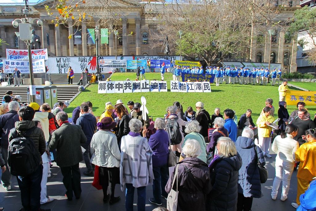 中午十二点,大游行结束后,在州立图书馆(State Library of Victoria)前举行了七二零反迫害集会。来自维州的各界人士,包括多位社区领袖到场声援,盛赞法轮功创造了伟大奇迹,二十年坚持不懈的和平抗争是为了所有人的福祉,呼吁澳洲人和澳洲政府站出来共同制止迫害。