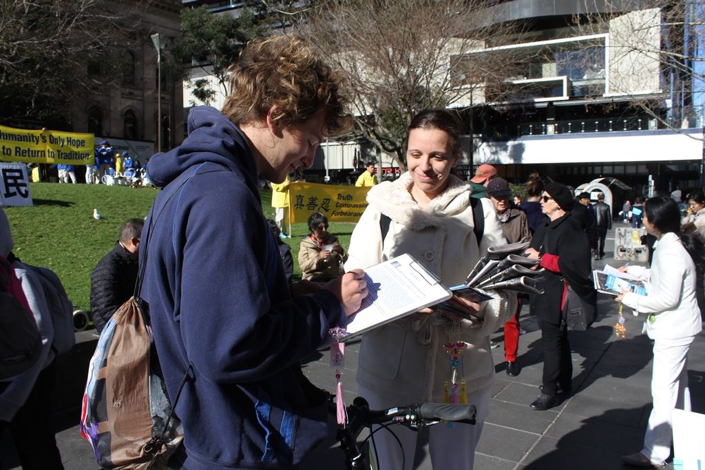 二十年来,和全世界大法弟子一起,墨尔本的法轮功学员风雨无阻坚守在中领馆、各旅游景点、闹市区,讲述真相、劝“三退”(退出中共党团队组织)、做征签,和平、理性反迫害。如今,中共的邪恶本质已经被越来越多的世人明了,法轮功反迫害已深植人心,犹如曙光穿破乌云,黎明已近。